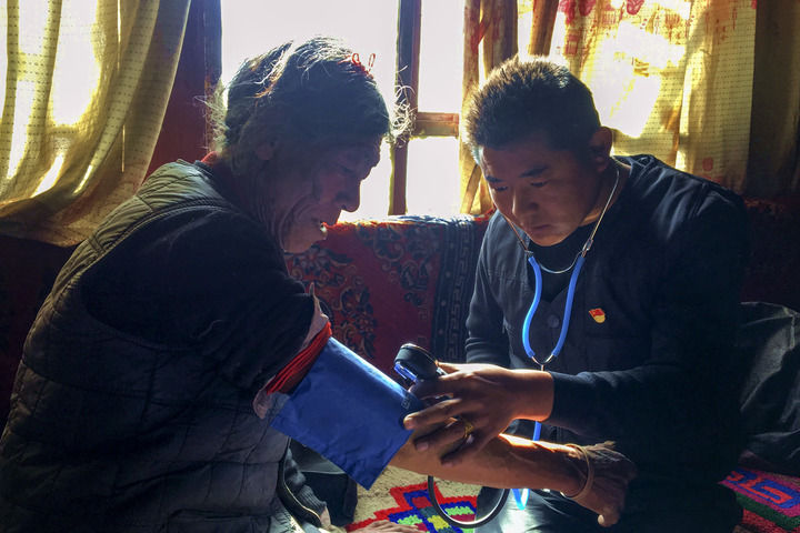楚鲁松杰乡卫生院院长次仁顿珠(右)在给巴卡村村民索朗多杰检查身体(2018年12月22日摄)。新华社记者 陈尚才 摄