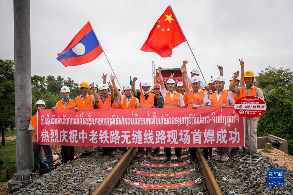 2020年6月18日,在老挝首都万象北郊,中国中铁二局员工庆祝中老铁路无缝线路现场首焊成功。新华社发(凯乔摄)