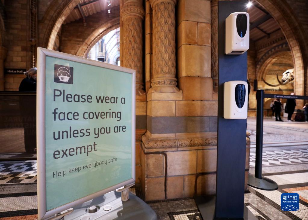 这是12月18日在英国伦敦自然历史博物馆门口拍摄的提醒人们佩戴口罩的提示牌。新华社记者 李颖 摄