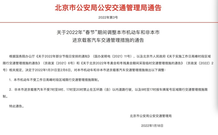 根据国务院办公厅《关于2022年部分节假日安排的通知》(国办发明电〔2021〕11号),以及北京市人民政府《关于实施工作日高峰时段区域限行交通管理措施的通告》(京政发〔2021〕6号)和《关于北京2022年冬奥会和冬残奥会期间采取临时交通管理措施的通告》(京政发〔2022〕2号)相关规定,决定于2022年1月31日至2月6日,对本市机动车和非本市进京载客汽车交通管理措施做出以下调整: