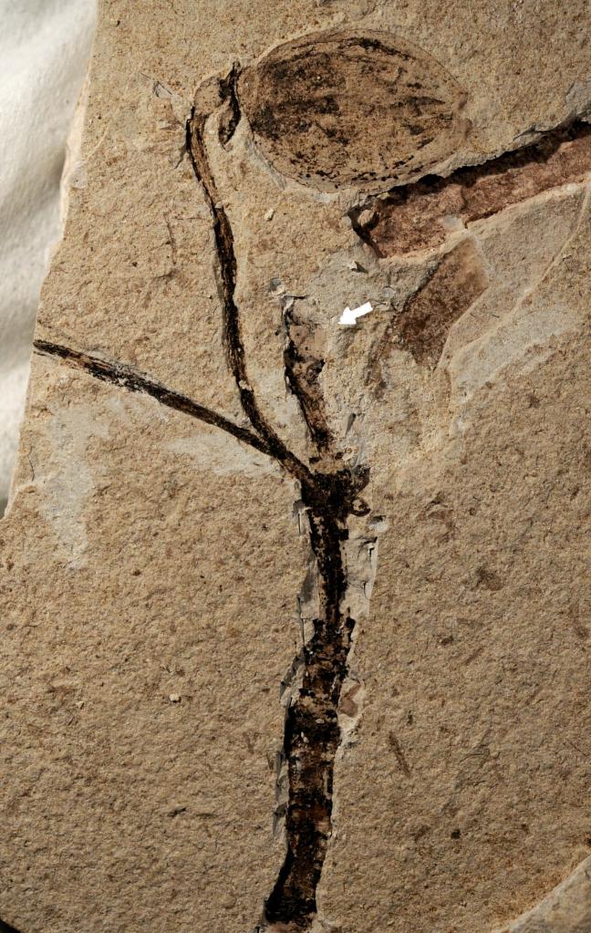 侏罗花蕾化石照片,箭头处为尚埋在岩石里的花蕾。中科院南京地质古生物研究所供图