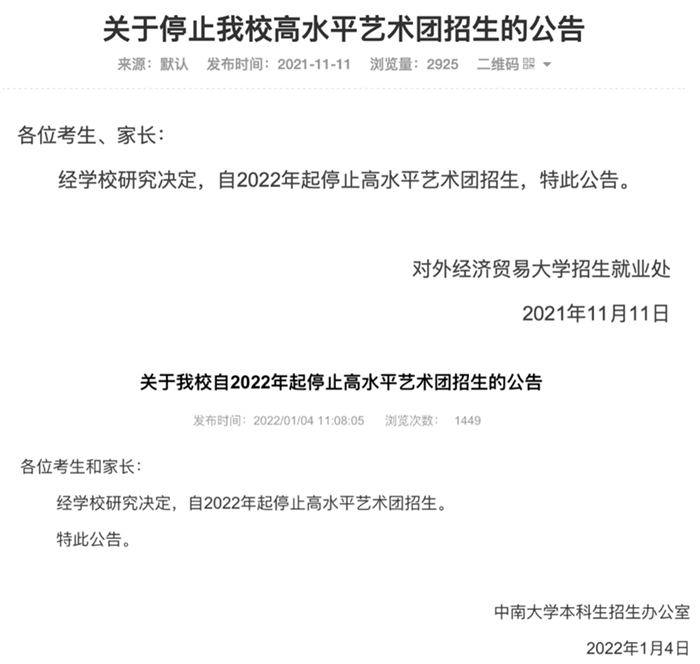 近期,中南大学、对外经济贸易大学发布通知,宣布2022年开始不再进行高水平艺术团招生,引发考生和家长高度关注。