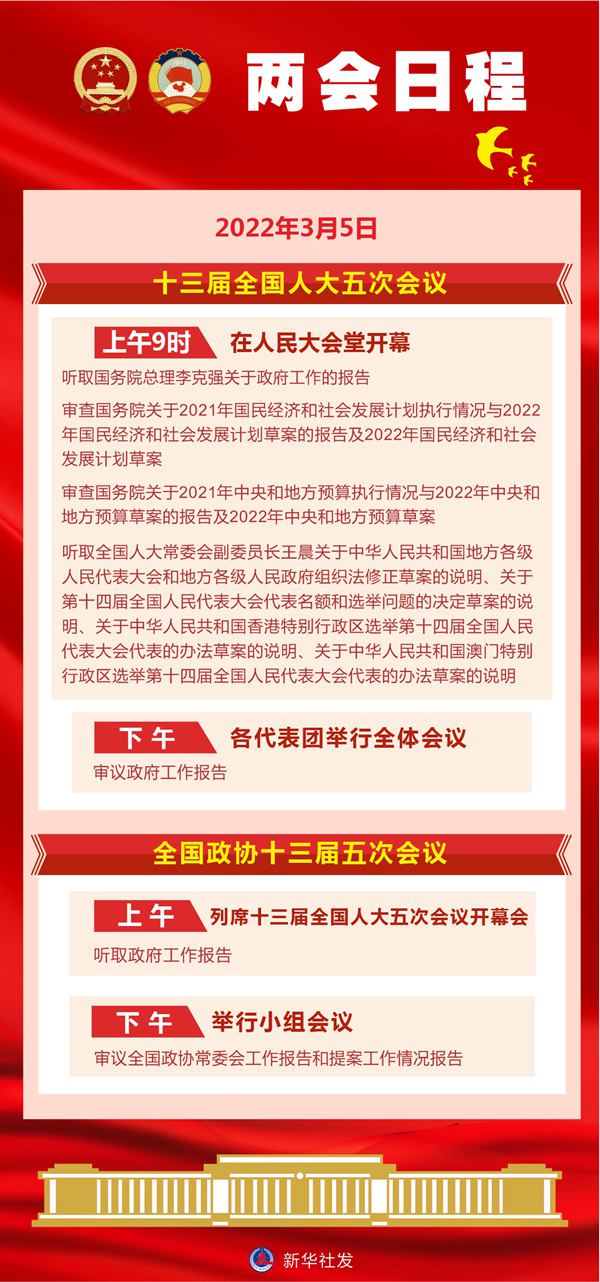 新华社北京3月4日电 十三届全国人大五次会议5日上午9时在人民大会堂开幕,听取国务院总理李克强关于政府工作的报告,审查国务院关于2021年国民经济和社会发展计划执行情况与2022年国民经济和社会发展计划草案的报告及2022年国民经济和社会发展计划草案,审查国务院关于2021年中央和地方预算执行情况与2022年中央和地方预算草案的报告及2022年中央和地方预算草案,听取全国人大常委会副委员长王晨关于中华人民共和国地方各级人民代表大会和地方各级人民政府组织法修正草案的说明、关于第十四届全国人民代表大会代表名额和选举问题的决定草案的说明、关于中华人民共和国香港特别行政区选举第十四届全国人民代表大会代表的办法草案的说明、关于中华人民共和国澳门特别行政区选举第十四届全国人民代表大会代表的办法草案的说明。下午,各代表团举行全体会议,审议政府工作报告。