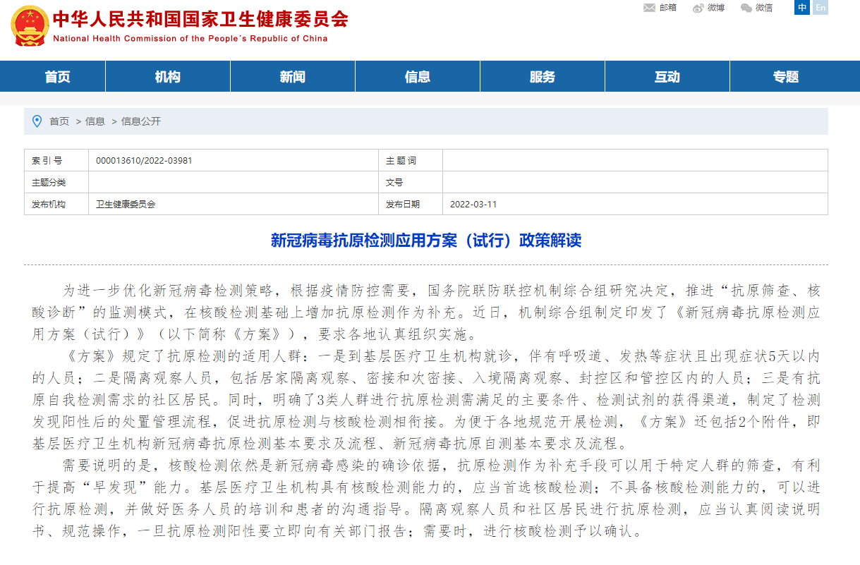 据国家卫健委消息,经研究,国务院应对新型冠状病毒肺炎疫情联防联控机制综合组决定在核酸检测基础上,增加抗原检测作为补充,并组织制定了《新冠病毒抗原检测应用方案(试行)》。