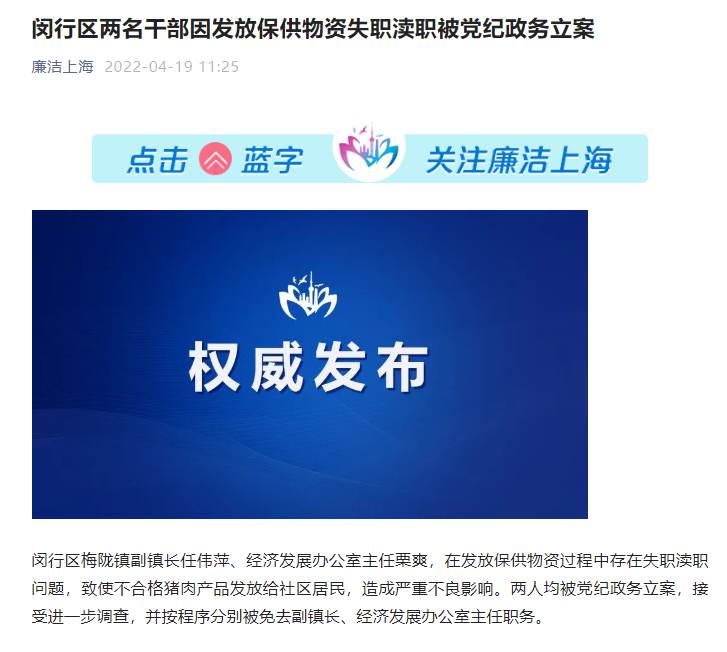 闵行区梅陇镇副镇长任伟萍、经济发展办公室主任栗爽,在发放保供物资过程中存在失职渎职问题,致使不合格猪肉产品发放给社区居民,造成严重不良影响。两人均被党纪政务立案,接受进一步调查,并按程序分别被免去副镇长、经济发展办公室主任职务。
