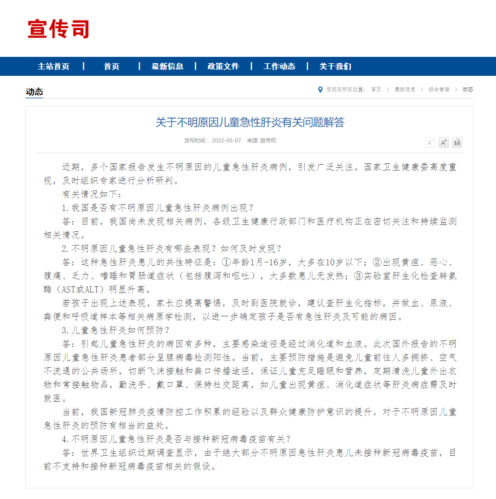 记者从国家卫健委获悉,近期,多个国家报告发生不明原因的儿童急性肝炎病例,引发广泛关注。对此,国家卫健委介绍:目前,我国尚未发现相关病例,各级卫生健康行政部门和医疗机构正在密切关注和持续监测相关情况。