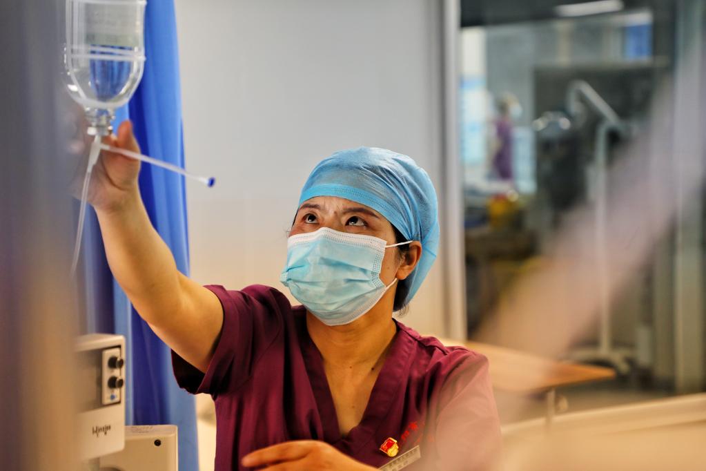 图为5月8日拍摄的脱亚莉为患者输液场景。新华社记者张睿摄