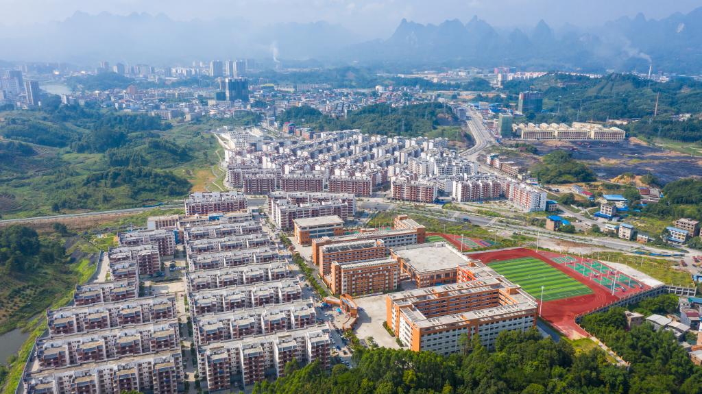 这是广西环江毛南族自治县毛南家园易地扶贫搬迁城北安置区(无人机照片)。(王淙岳摄)