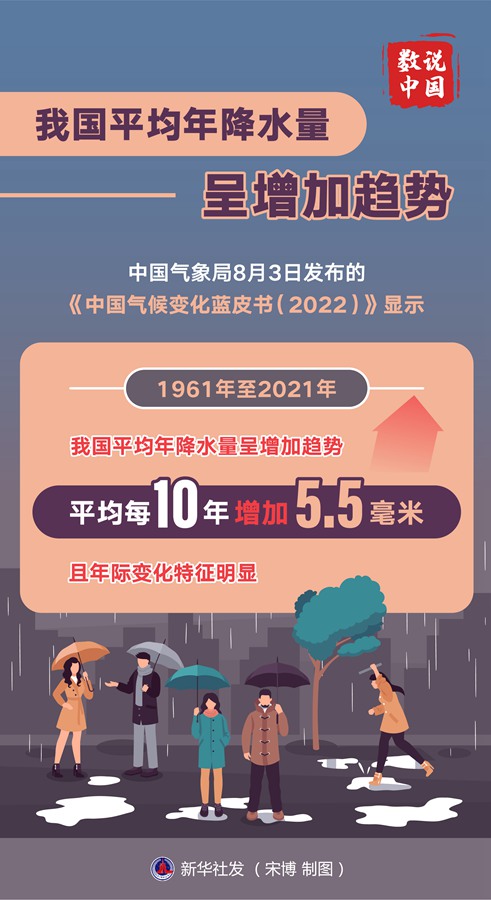 新华社北京8月3日电(记者黄垚)中国气象局3日发布的《中国气候变化蓝皮书(2022)》显示,1961年至2021年,我国平均年降水量呈增加趋势,平均每10年增加5.5毫米,且年际变化特征明显。