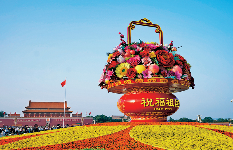 国庆节前夕,“祝福祖国”巨型花果篮亮相北京天安门广场。今年“祝福祖国”巨型花果篮顶高18米,以喜庆的花果篮为主景,花坛底部直径48米。图为2022年9月25日拍摄的“祝福祖国”巨型花果篮。 新华社记者 陈钟昊/摄
