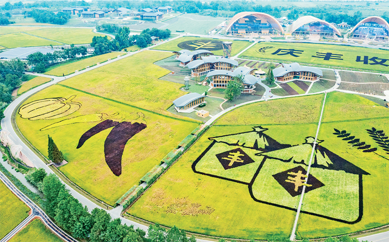 2022年中国农民丰收节主会场活动于9月23日至10月7日在中国天府农业博览园举办。这是9月22日在中国天府农业博览园拍摄的稻田画(无人机照片)。 新华社记者 沈伯韩/摄