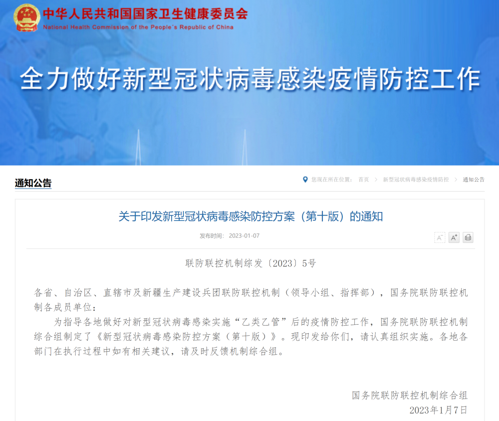 关于印发新型冠状病毒感染防控方案(第十版)的通知