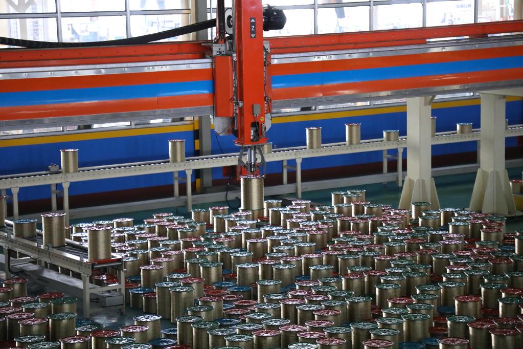 在山东大业股份有限公司智能化检配中心,龙门吊自动抓取钢圈。新华社记者 王厚原摄