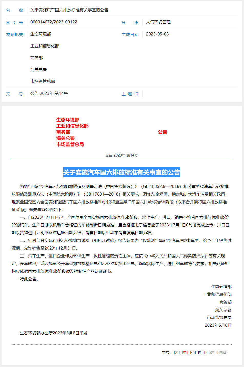 为执行《轻型汽车污染物排放限值及测量方法(中国第六阶段)》(GB 18352.6—2016)和《重型柴油车污染物排放限值及测量方法(中国第六阶段)》(GB 17691—2018)相关要求,落实助企纾困、稳定和扩大汽车消费相关政策,现就全国范围内全面实施轻型汽车国六排放标准6b阶段和重型柴油车国六排放标准6b阶段(以下合并简称国六排放标准6b阶段)有关事宜公告如下: