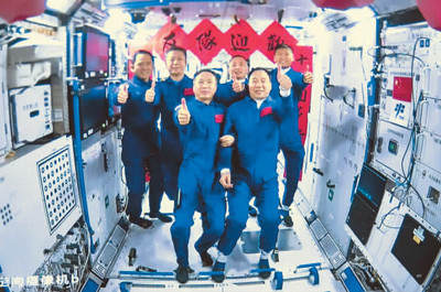 神舟十五号航天员乘组与神舟十六号航天员乘组拍下“全家福”。