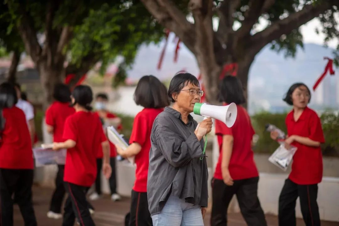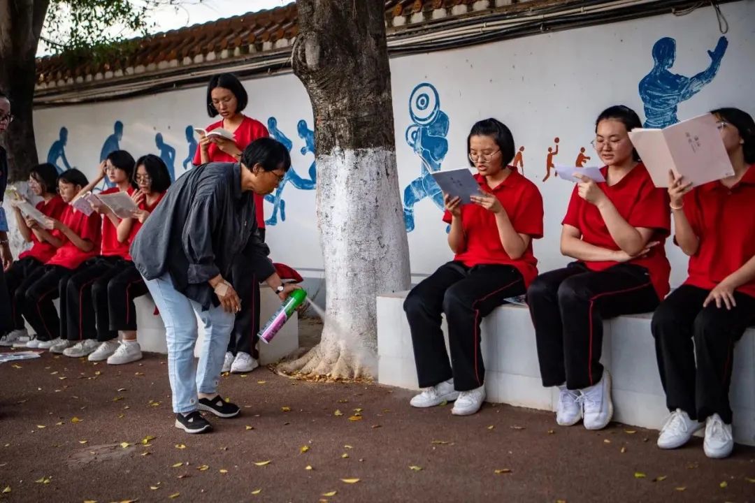 早早到了考点,姑娘们靠着围墙坐成一排,抓紧最后的时间温习功课。张桂梅片刻未歇,拿出提前准备好的驱蚊剂,弓着腰,缓慢移动着,朝着孩子们的脚上喷去。