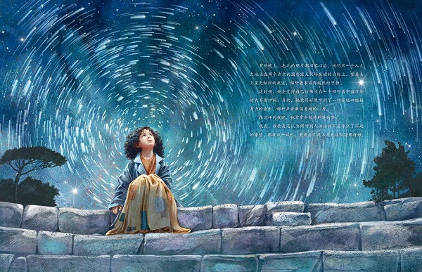 故事的主人公毛毛住在大城市郊区一个圆形剧场的废墟里。没人知道她从哪里来,但每个人都知道她的天赋:以一种非常特殊的方式倾听。她能倾听镇上的人们、孩子们的话语,也能倾听动物的语言,甚至是树上的风声,当她倾听时,发生了很多不可思议的故事。切卡雷利用具有艺术质感的画作将这部经典作品转化为图像语言,整本书以蓝、黄为主色调,自始至终带有某种神秘的梦幻色彩,静谧而美丽。