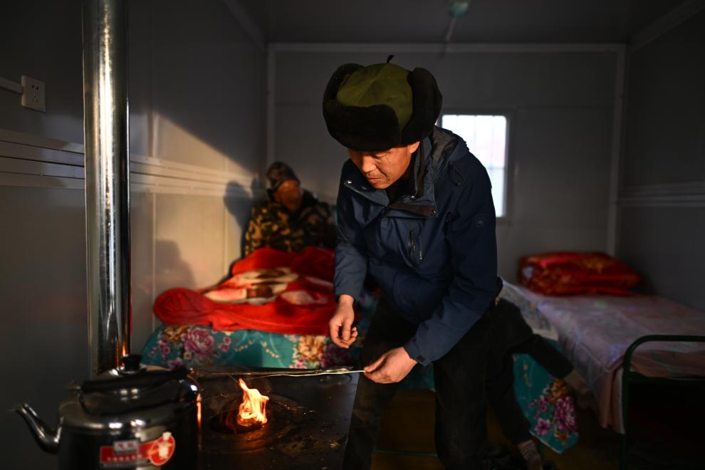 12月22日,在青海省海东市民和回族土族自治县官亭镇喇家村安置点,村民李贵恩(前)往火炉中添加煤块。新华社记者 张宏祥 摄