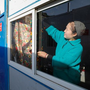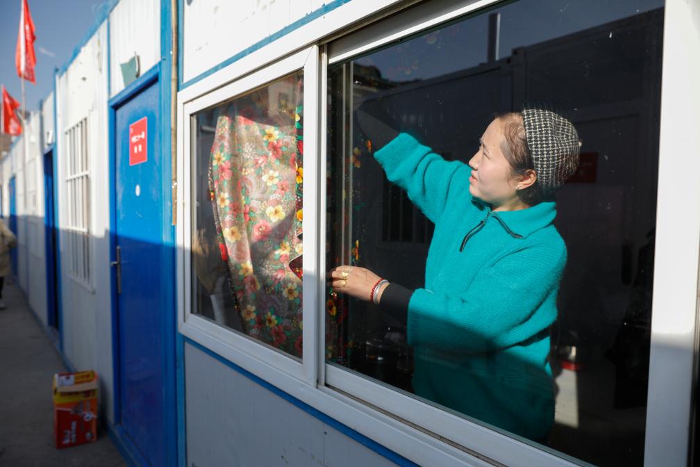 12月22日,在积石山县大河家镇梅坡村活动板房安置点,受灾村民张法土麦在挂窗帘。新华社记者 方欣 摄