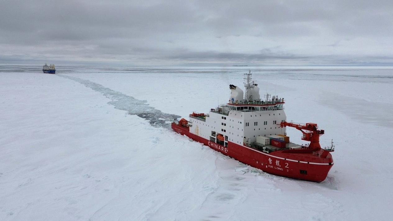 12月3日,“雪龙2”号为“天惠”轮破冰引航(无人机照片)。新华社发(祝贺 摄)