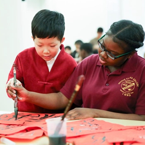 2018年2月2日,在美国纽约举行的文化交流活动上,来自北京的小学生教纽约梅德加·埃弗斯学院预备学校的学生练习中国书法。新华社记者王迎摄