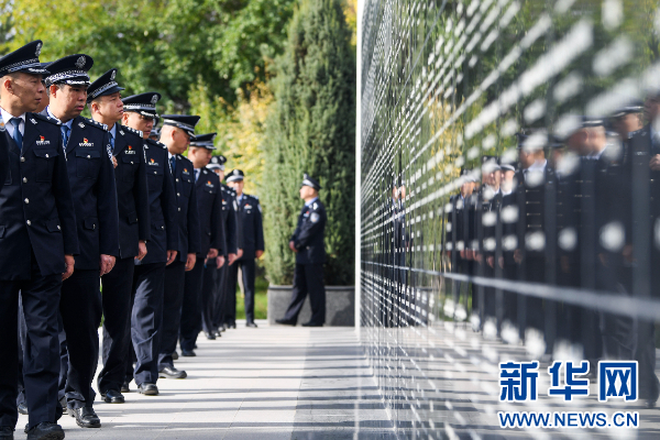 2021年9月30日是烈士纪念日,在新疆公安英烈纪念园,新疆维吾尔自治区公安厅民警代表在祭奠英烈。