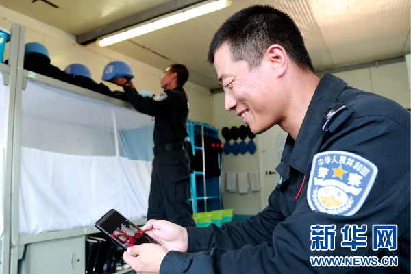 2017年4月4日,在利比里亚蒙罗维亚中国维和警察防暴队营区,一名队员翻看家人照片。