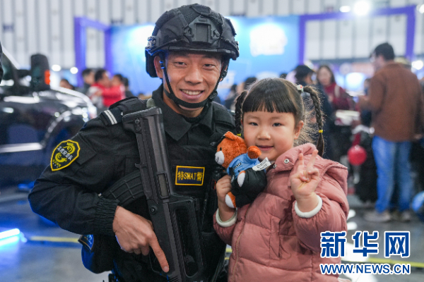 2024年1月6日,在警营开放周活动现场,小朋友和特警合影。