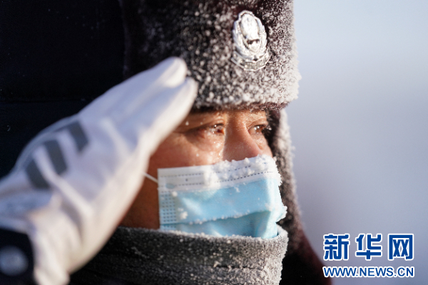 2021年1月8日,黑龙江省大兴安岭地区呼中区公安局交警孙臣顶着寒风上岗执勤,极寒天气使他的眼睫毛和帽子都上了霜。