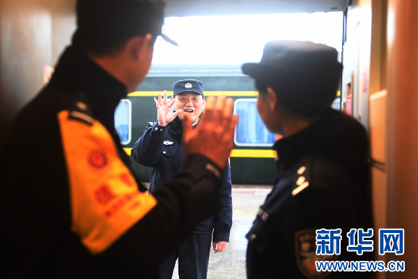 2018年2月20日,武汉铁路公安处老民警王梨英(中)和女儿女婿短聚后又分别送他们登车回岗。