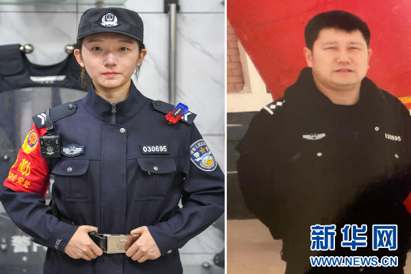 左图为朱荣超在长春铁路公安处长春车站派出所执勤(1月9日摄);右图为朱荣超父亲朱铁民生前照片。