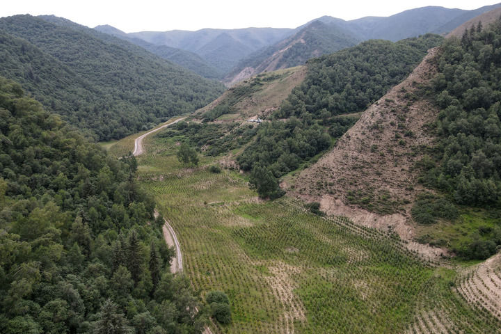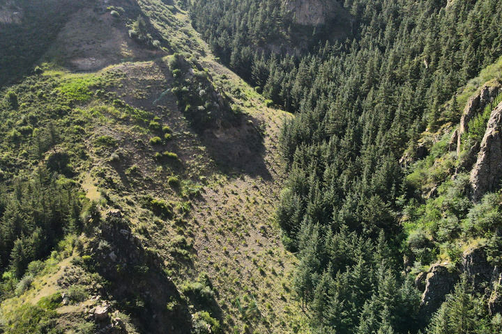 这是2023年8月2日在武威市天祝藏族自治县拍摄的千马龙煤矿关停退出后的生态修复情况(无人机照片)。新华每日电讯记者张智敏摄