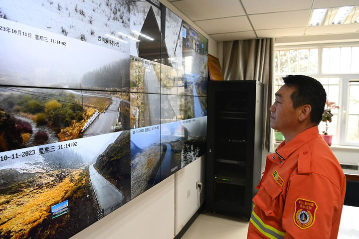 在甘肃祁连山国家级自然保护区管护中心西水自然保护站观台资源管护站,工作人员通过监控查看管护区域内实时动态。新华每日电讯记者范培珅摄
