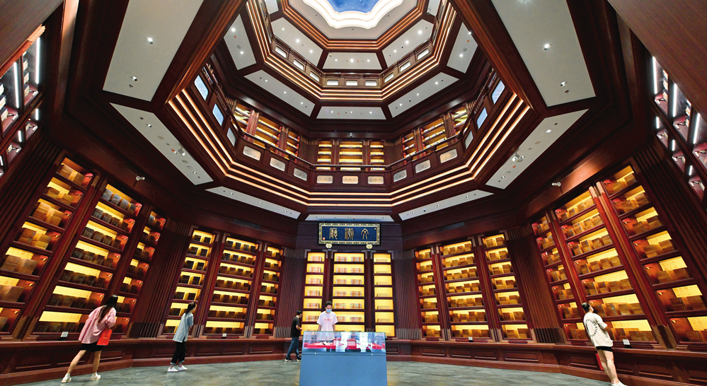 观众在位于北京的中国国家版本馆中央总馆文瀚厅内参观(2022年7月30日摄)李鑫摄 / 本刊