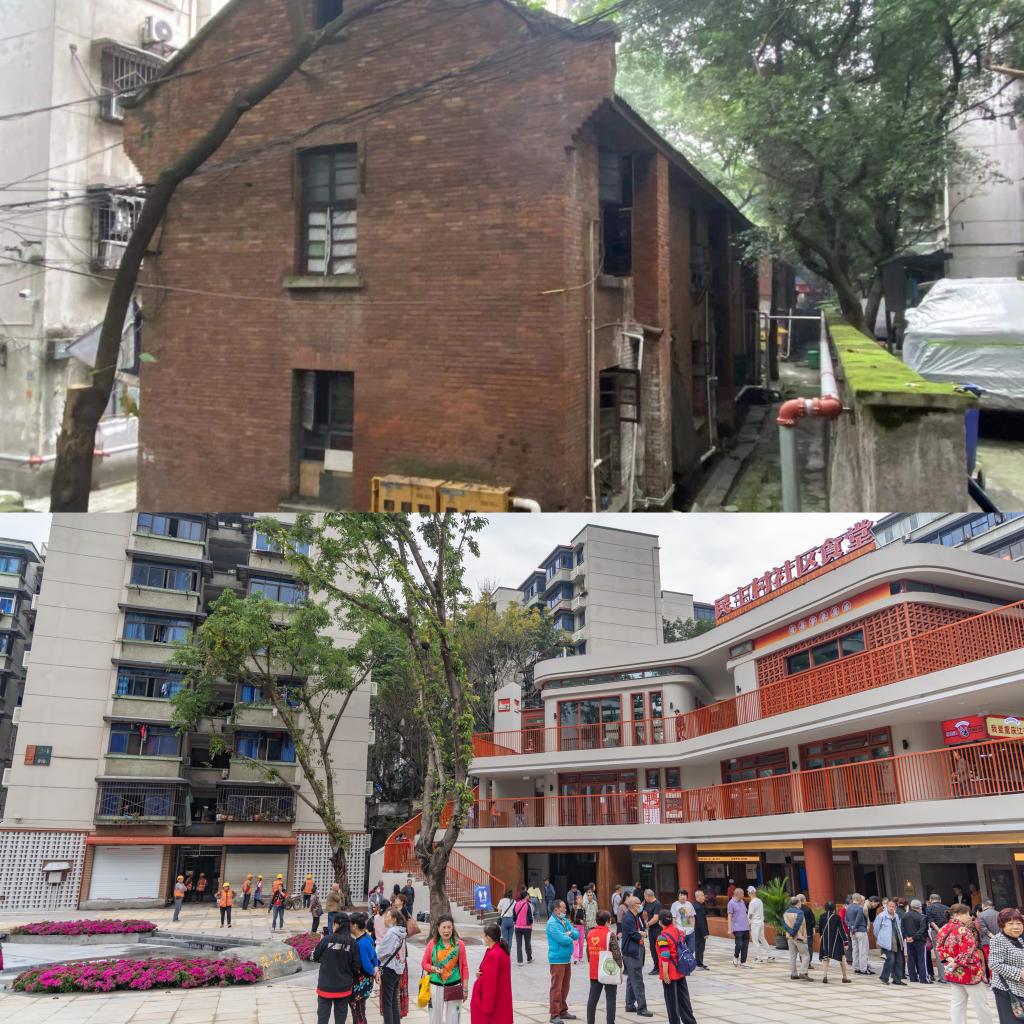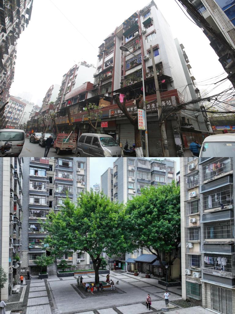 拼版照片:上图为重庆市九龙坡区民主村社区改造更新前的一幢老建筑(资料照片)。新华社 发 下图为重庆市九龙坡区民主村社区改造更新后的社区广场。新华社记者 黄伟 摄
