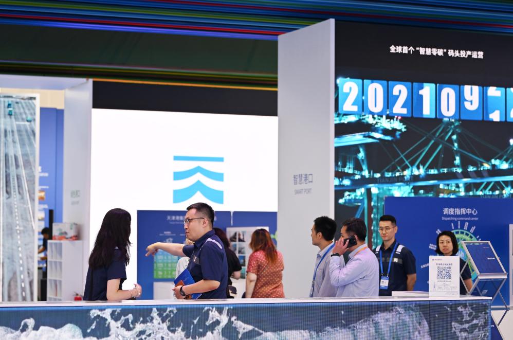 7月11日,与会者在博览会上的天津港展台参观交流。新华社记者 李然 摄