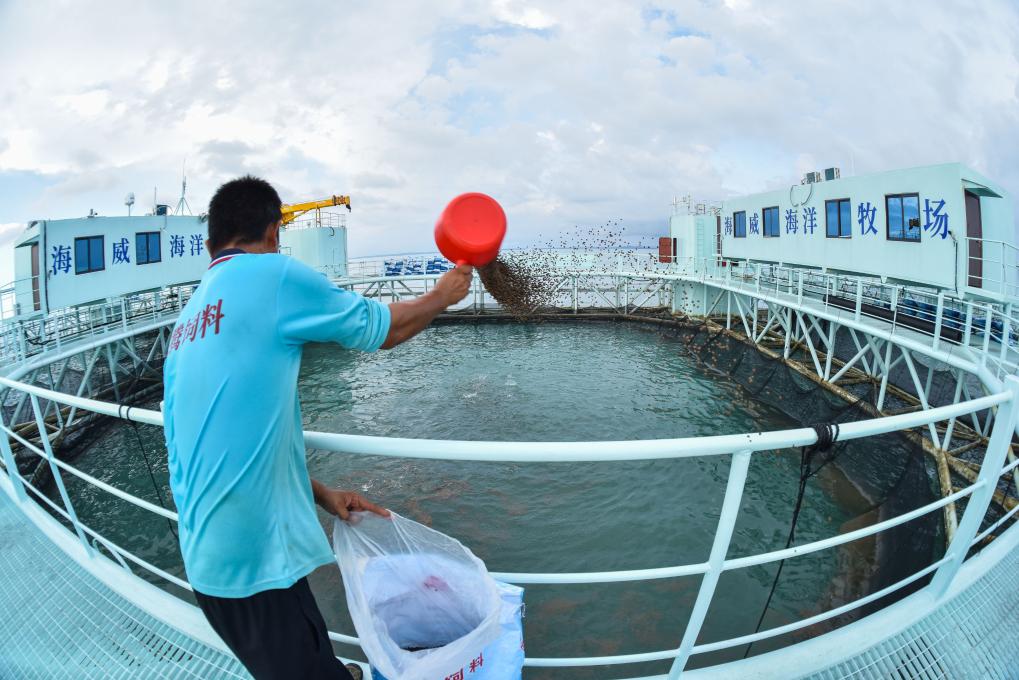 2023年9月20日,饲养管理员在“海威2号”上向金鲳鱼苗投喂饲料。新华社记者 刘大伟 摄