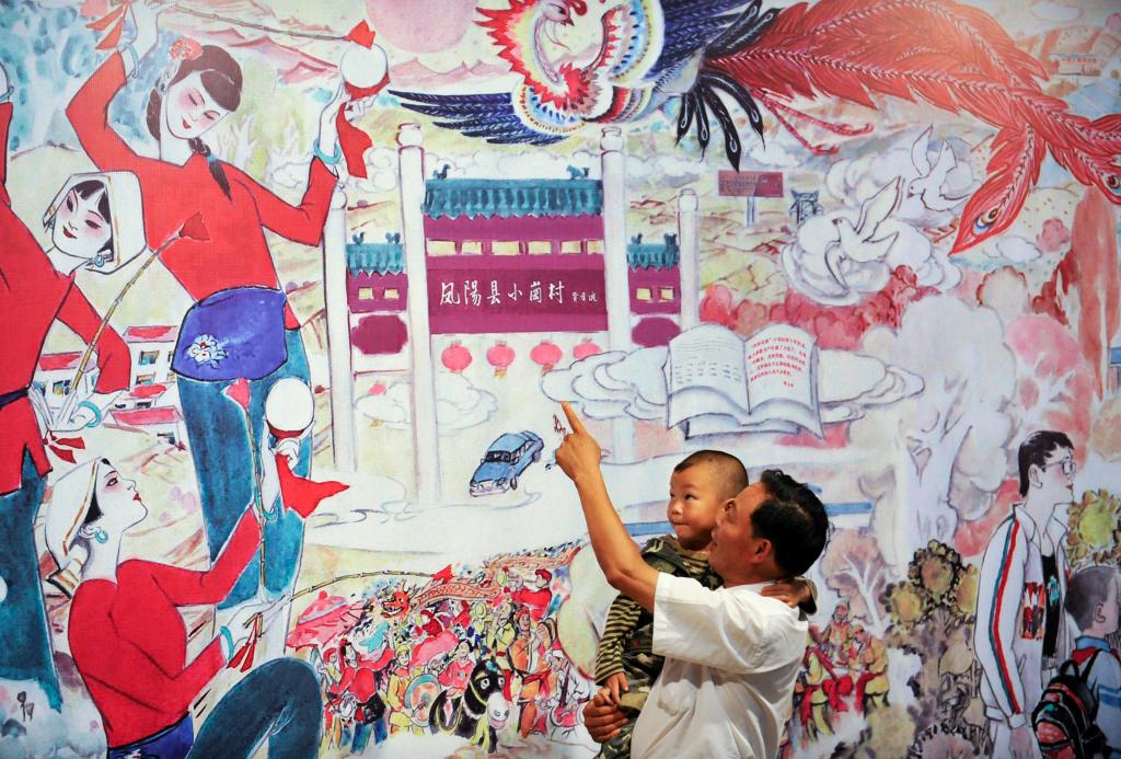 严宏昌带着孙子参观村里的“大包干纪念馆”(2009年8月8日摄)。