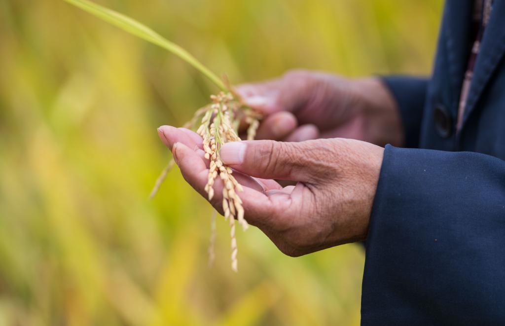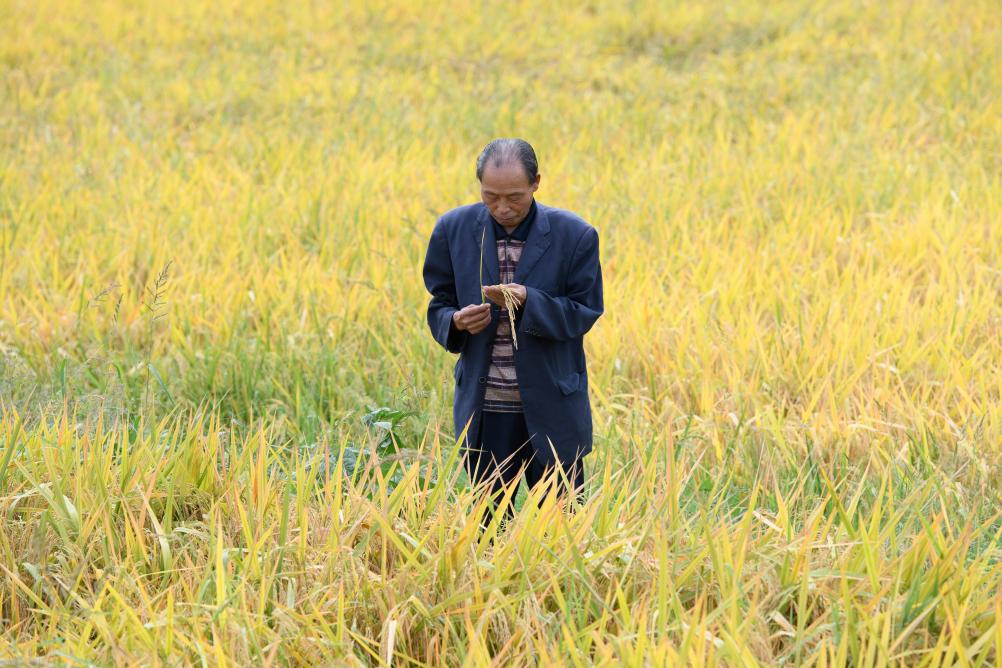 9月26日,严宏昌在自家稻田里查看即将收获的水稻。