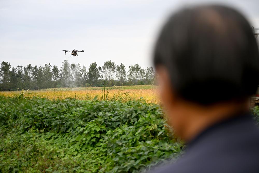 9月26日,小岗村村民使用植保无人机,严宏昌在一旁观看。
