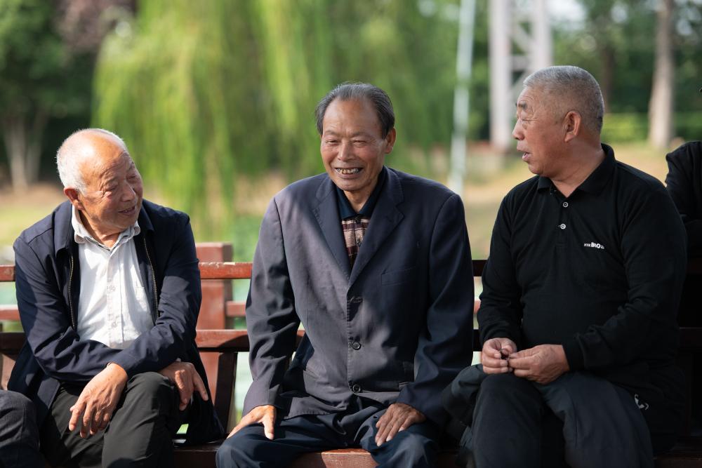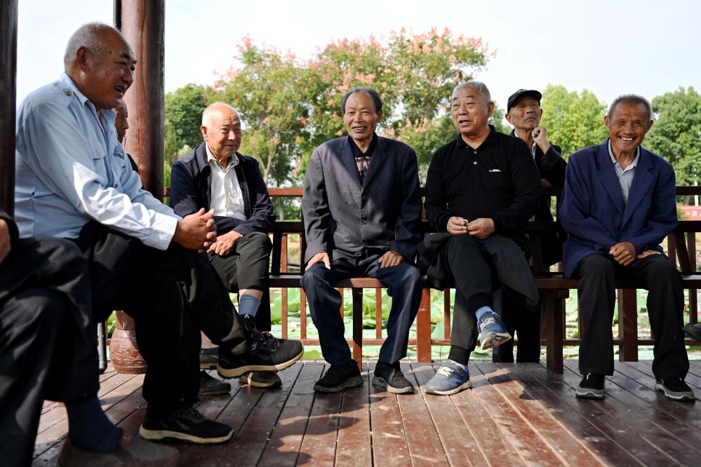9月27日,安徽省滁州市凤阳县小岗村,严宏昌(右四)与村中老人聊天。