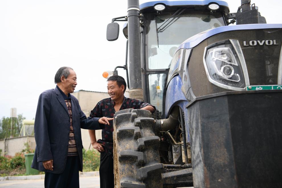 9月26日,安徽省滁州市凤阳县小岗村,严宏昌(左)和二儿子严德宝在家中院子里的一台大型拖拉机旁交流。