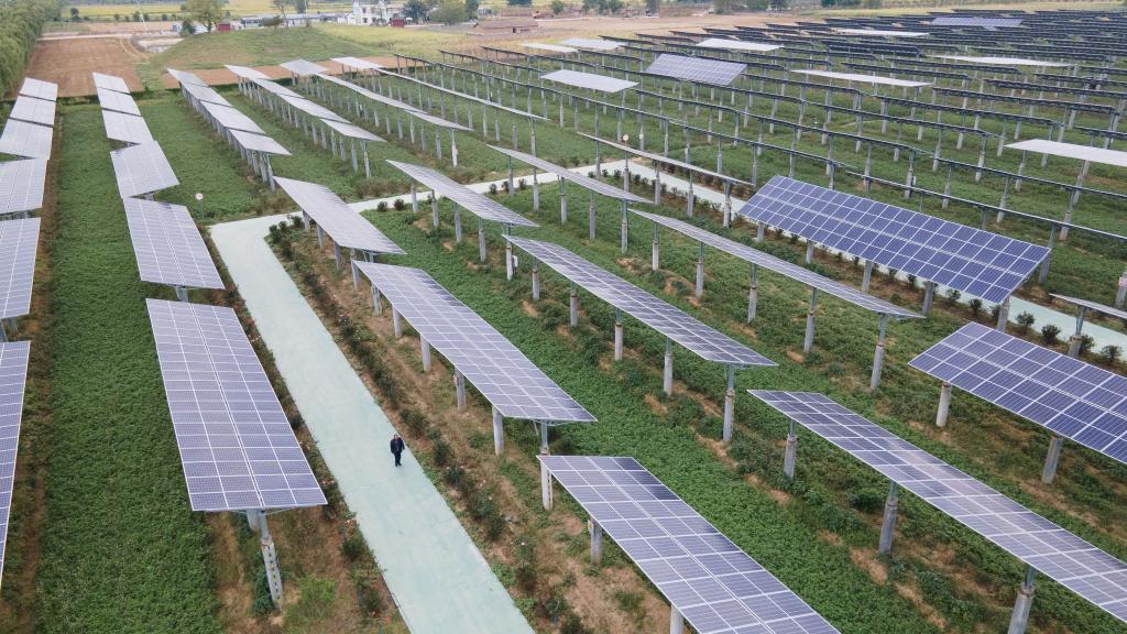 9月26日,严宏昌在小岗村农光互补体验园参观(无人机照片)。