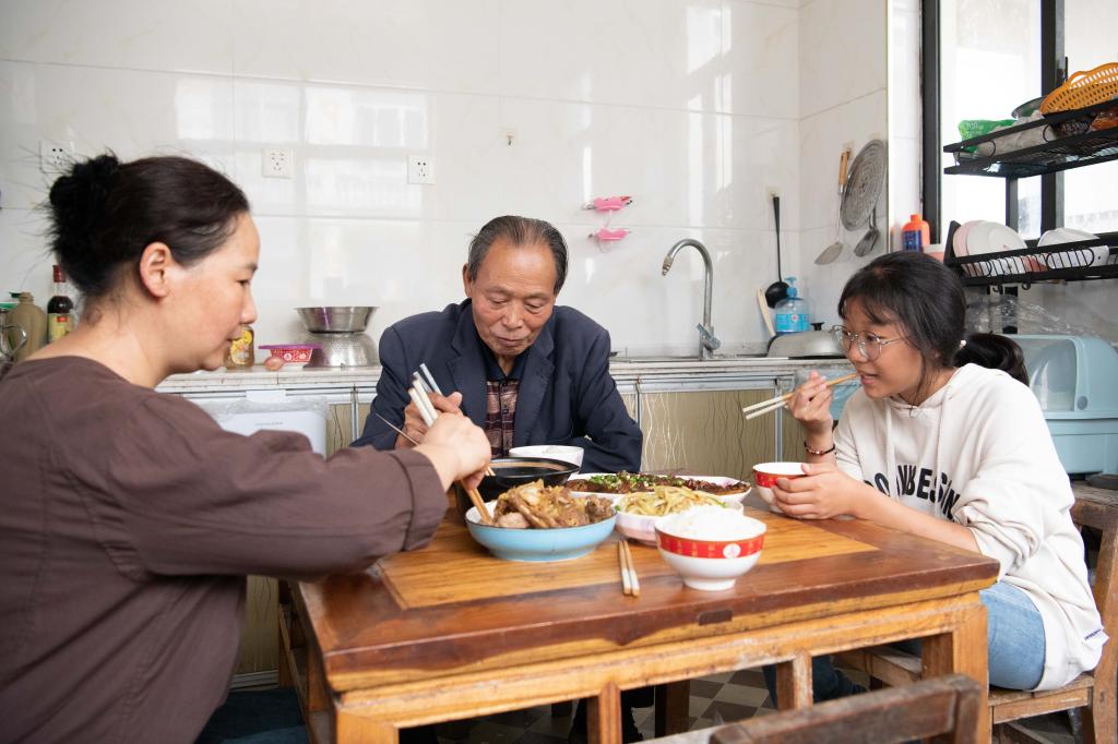9月26日,安徽省滁州市凤阳县小岗村,严宏昌(中)和家人一起吃午饭。