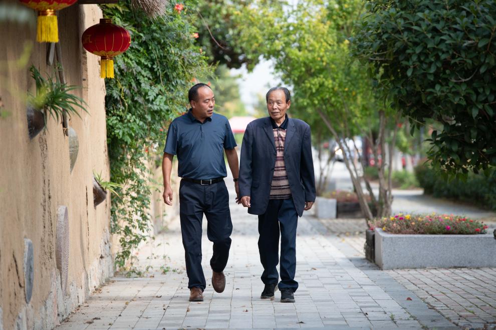 9月26日,安徽省滁州市凤阳县小岗村,大儿子严余山陪着严宏昌(右)在村中散步。严余山现任小岗村党委副书记,分管产业发展、招商引资、乡村振兴工作。