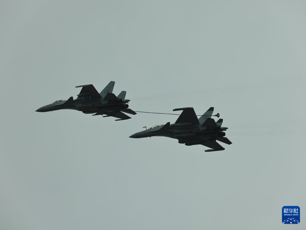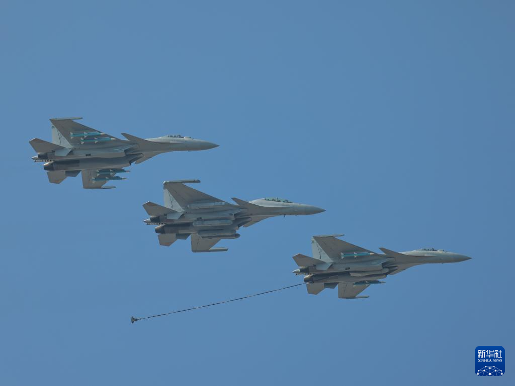 海军歼-15系列舰载战斗机编队在广东珠海进行适应性飞行训练,展示伙伴加油课目(11月10日摄)。新华社发(吕志浩摄)