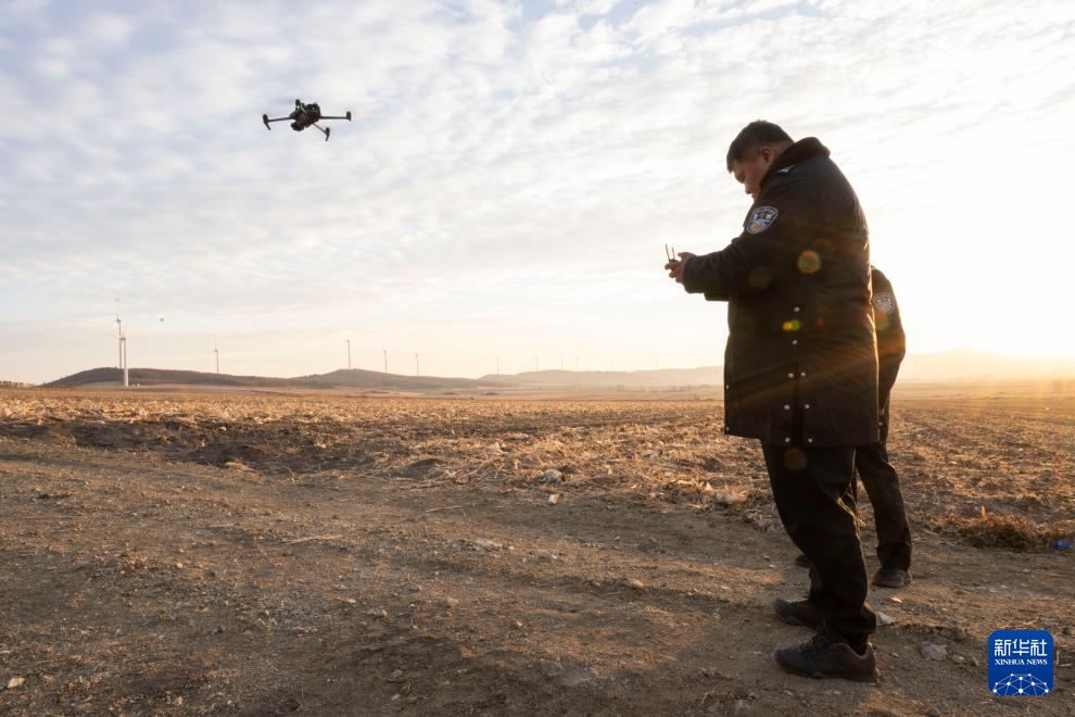 在黑龙江省勃利县吉兴朝鲜族满族乡长太村附近,勃利县公安局民警用无人机搜寻东北虎踪迹(11月19日摄)。新华社记者 谢剑飞 摄