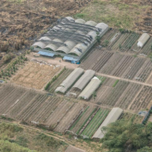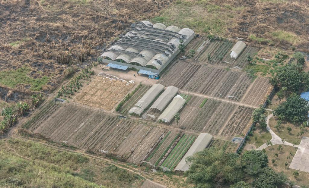 这是8月3日拍摄的位于刚果(布)首都布拉柴维尔的中国援刚果(布)农业技术示范中心大棚(无人机照片)。新华社记者王冠森摄