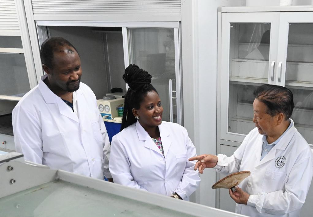 8月26日,林占熺教授(右)在福建农林大学向卢旺达留学生介绍菌草栽培灵芝技术。上世纪九十年代末,中国菌草技术开始逐渐走向海外,为全球减贫事业贡献独特的中国方案和中国智慧。如今,菌草技术以培训、教育、合作与援助等方式在40余个非洲国家落地生根,持续在这片土地上播撒希望和友谊。菌草不仅仅是“致富草”“幸福草”,更是连结中非的“友谊草”。新华社记者林善传摄