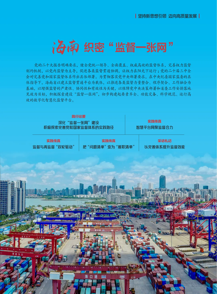 习近平总书记对海南自由贸易港建设作出重要指示强调,“要把制度集成创新摆在突出位置”。海南紧紧扭住“制度集成创新”这个核心,持续推进“监督一张网”建设,探索以党内监督为主导、各类监督贯通协调的实践路径。